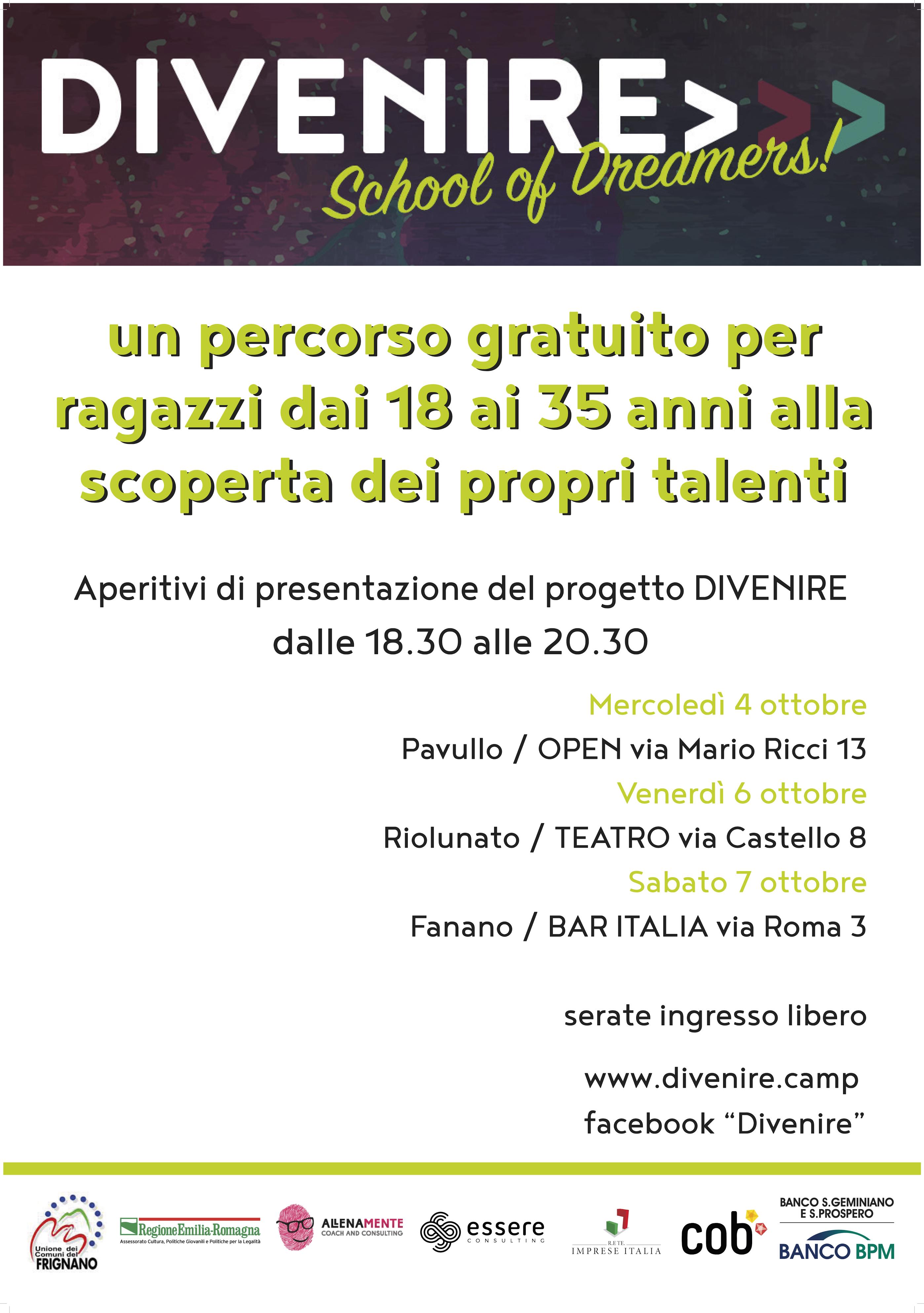 DIVENIRE - SCHOOL OF DREAMERS è un percorso di formazione gratuita per i giovani dai 18 ai 35 anni che abitano nel territorio dell'Unione dei Comuni del Frignano, volto a fornire gli strumenti più utili per affrontare ogni scelta personale o professionale e ad avvicinarli al mondo del lavoro.