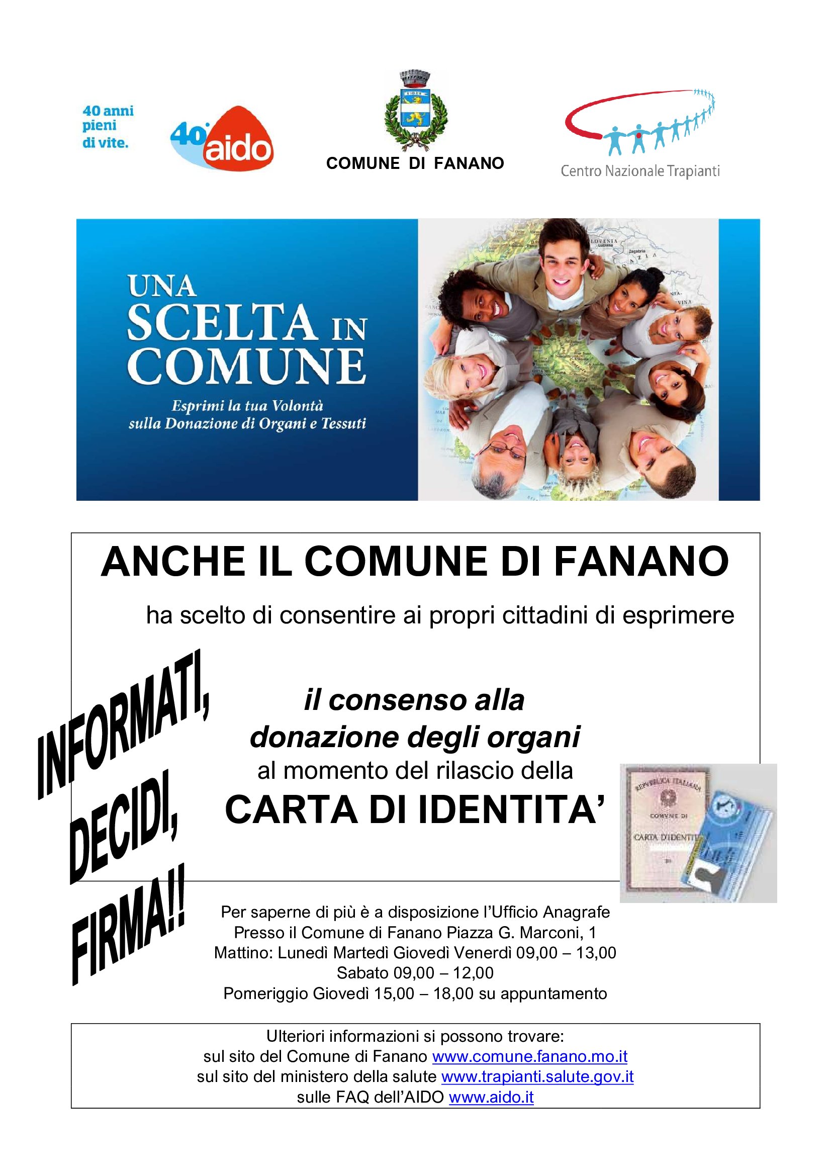 Anche il Comune di Fanano ha scelto di consentire ai propri cittadini di esprimere il consenso alla donazione degli organi al momento del rilascio della CARTA DI IDENTITA’ !!!