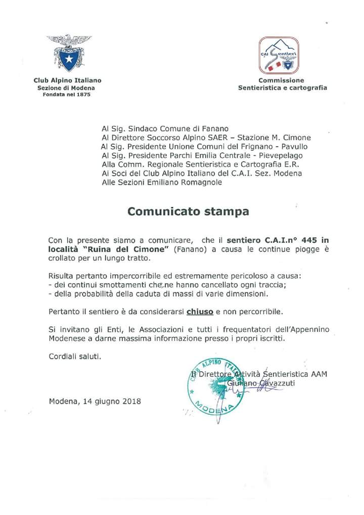 Il sentiero CAI 445, in località "Ruina del Cimone", a causa delle abbondanti e continue pioggie delle scorse settimane, è crollato per un lungo tratto e a rischio smottamenti e caduta massi.